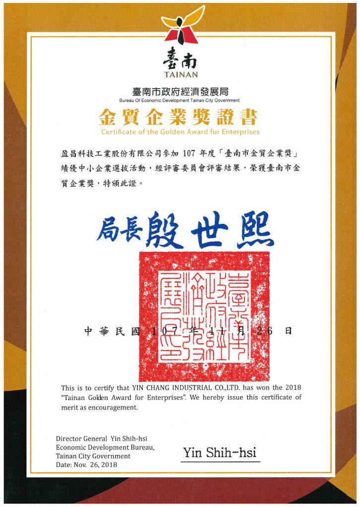 榮獲台南市政府評鑑為107年度績優中小企業選拔之『台南市金質企業獎』。